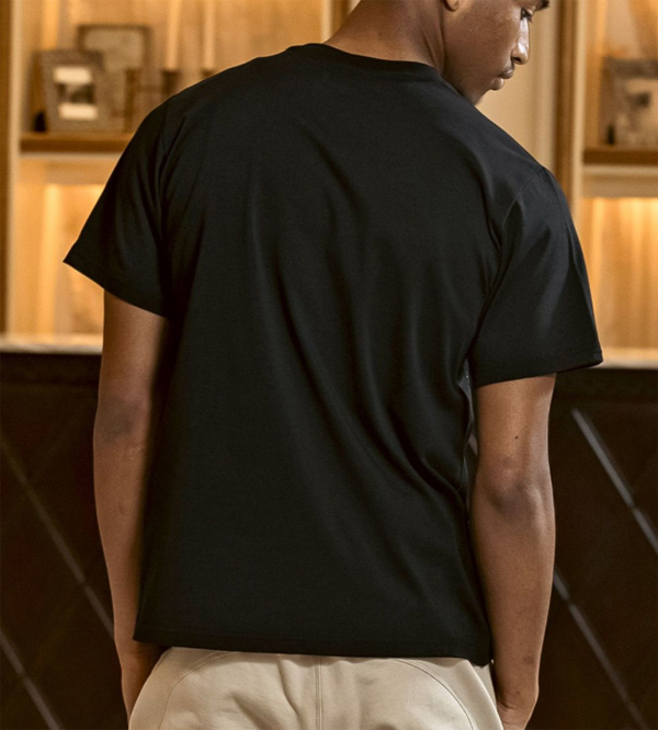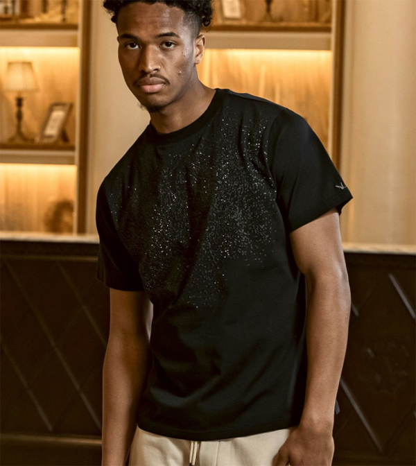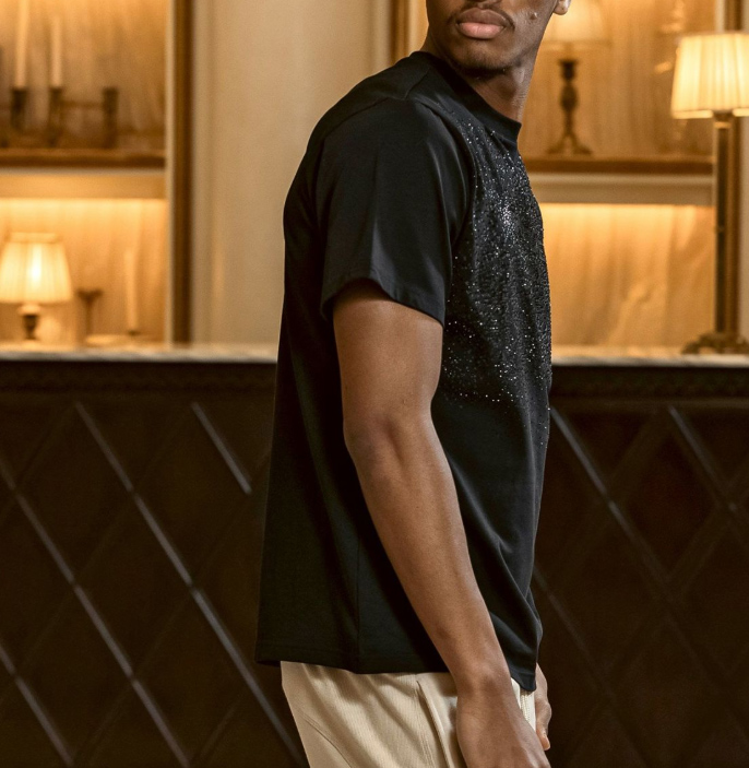 胸元にラインストーンとプリントを散りばめた華やかなデザインの半袖カットソー。