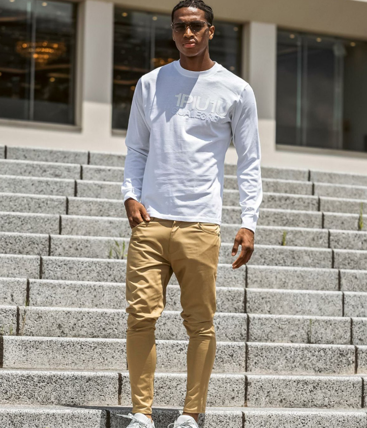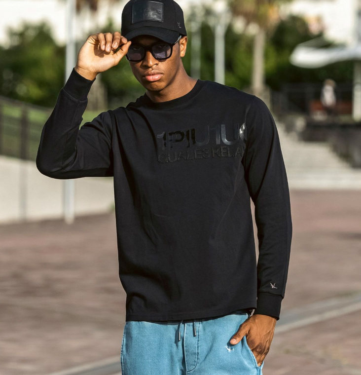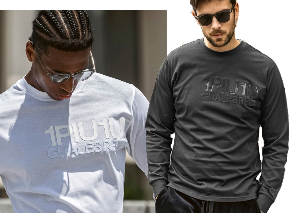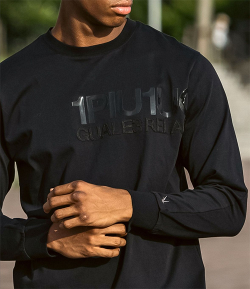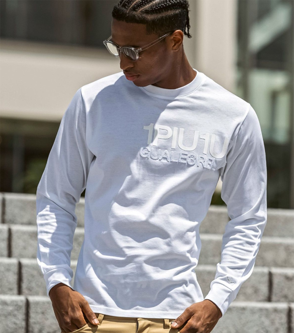 異なる加工のロゴを2段に配置した長袖カットソー。