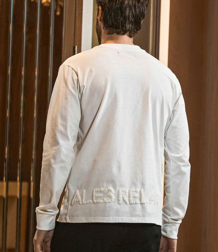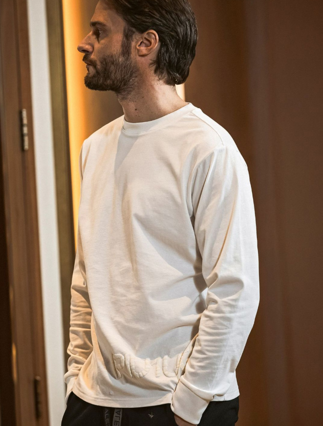 発泡プリントの印象的なロゴを裾に配置した長袖カットソー。